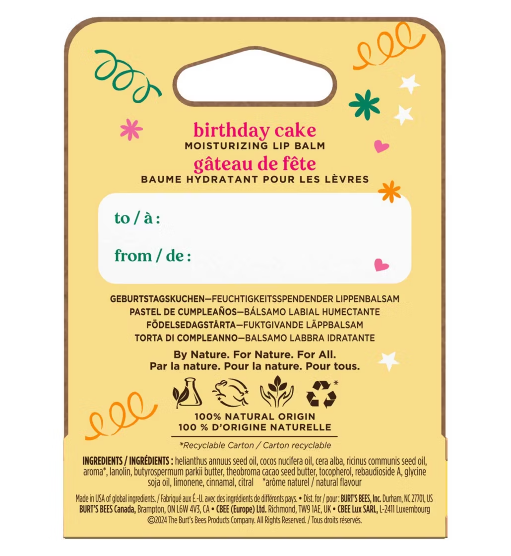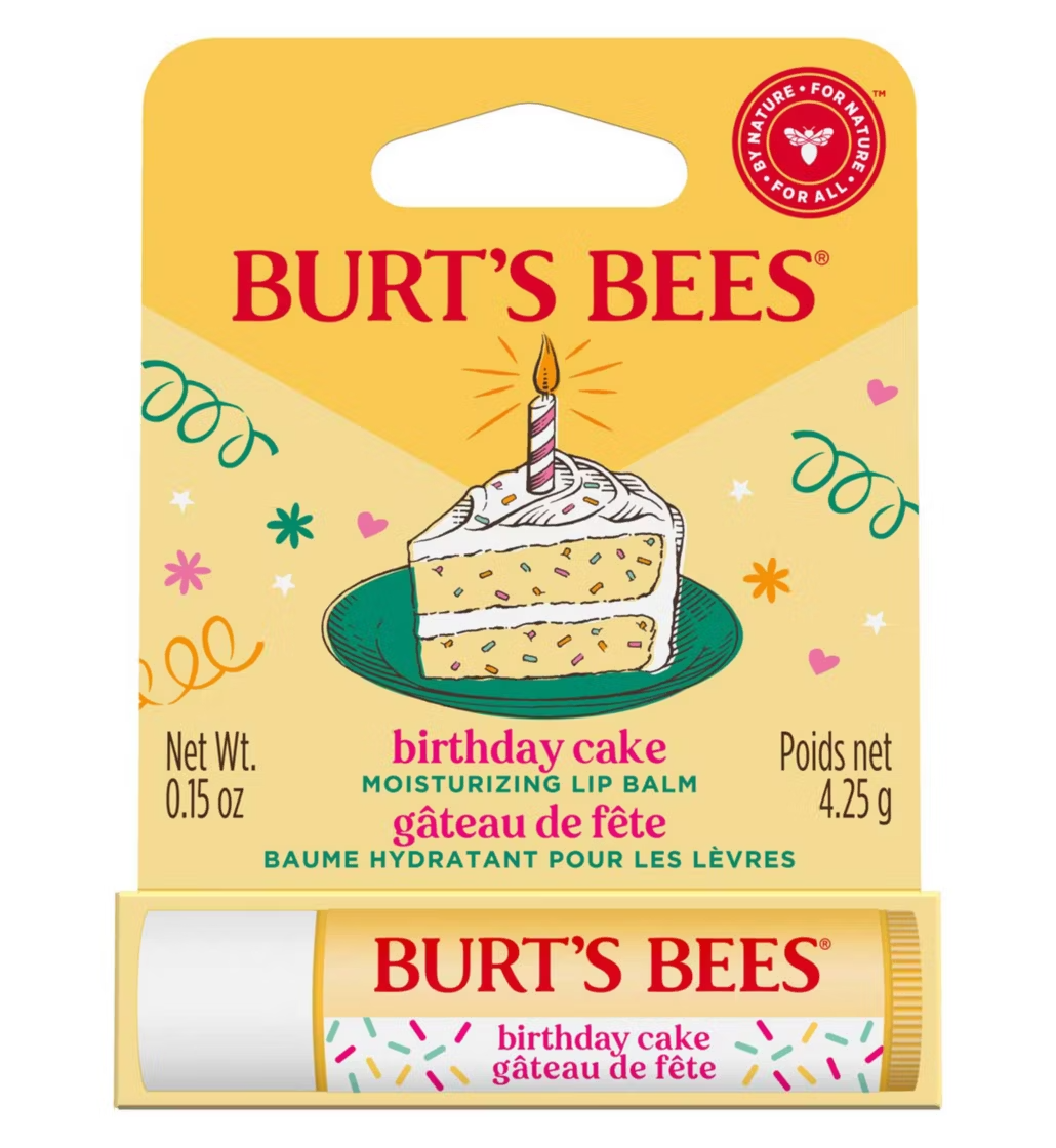 Have your cake and wear it too! Burt’s Bees Birthday Cake flavoured lip balm has a delectable, super sweet, vanilla scent. This moisturising lip balm is a fun gift for anyone celebrating a birthday, with birthday themed packaging for you to personalise. And it has all the benefits of our other lip balms too, so you’ll get the same intense moisture and nourishing hydration, all thanks to responsibly sourced beeswax, vitamin E and nourishing oils & butters.