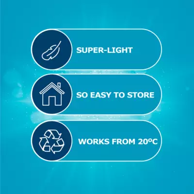 Extra Cleaning Power. 100% Dissolvable. Fresh Breeze. 7 Days Up to Scent. Works from 20°C. Easy Dosing. Fresh Cleanliness. Free from preservatives.
